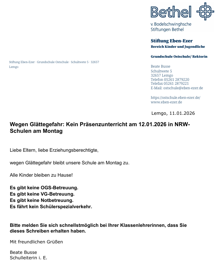 das Schulministerium NRW hat entschieden, dass der Präsenzunterricht am Montag, den 12.01.2026 nicht stattfinden wird.
